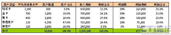 同時,如下表2所示,我們給定了不同客戶分群的客戶平均月消費水平及利潤貢獻比率。通過計算可以得出,高端的鉆石卡客戶雖然僅占客戶數的3%,貢獻了收入的15.5%,卻貢獻了三分之一的利潤。而占近半數的普通客戶,大約貢獻了收入的四分之一,僅僅貢獻了利潤了10%左右。在一些行業(yè)中,服務和交易成本所占比重較高,普通客戶群甚至有可能會帶來負利潤。