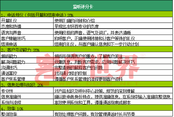 b.一個(gè)不可忽視的工作是對(duì)表中的各項(xiàng)進(jìn)行嚴(yán)格定義,然后訓(xùn)導(dǎo)師與主管、培訓(xùn)、質(zhì)檢師根據(jù)共同的錄音資料反復(fù)“核對(duì)筆記”,取得共識(shí),并將樣本打分結(jié)果發(fā)給座席代表溫習(xí)。