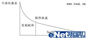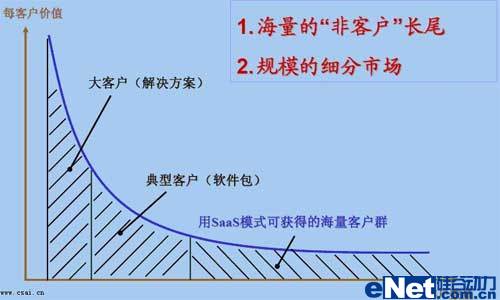 SaaS模式就是不論是什么樣的客戶(hù)都向其提供服務(wù),不論服務(wù)的時(shí)間長(zhǎng)短,不論身處何地。傳統(tǒng)軟件是很難適應(yīng)普通客戶(hù)的,普通客戶(hù)付不出更多的投資,也不想軟件、硬件、服務(wù)都全面去投資,這樣就只有放棄使用軟件了。自然,軟件市場(chǎng)就少了一大群消費(fèi)者。而SaaS模式將不細(xì)分客戶(hù)類(lèi)型,讓人人都可使用軟件,讓個(gè)個(gè)都消費(fèi)得起軟件。可想而知,這是一個(gè)怎么龐大的市場(chǎng)。如下圖所示: