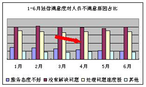 客服代表的工作情緒及客戶滿意度呈現(xiàn)上升趨勢:3-6月的短信滿意度穩(wěn)步提升(見下圖1),6月短信滿意度較3月提升1.25個百分點,短信滿意度調(diào)查中“非常滿意”項占比自4月份開上升1.42個百分點(見下圖2)。從客戶不滿意原因情況看,由于人員導(dǎo)致客戶不滿意的比例下降0.6%(見下圖3);對導(dǎo)致人員不滿意的原因分析可知,話務(wù)員服務(wù)態(tài)度不好的占比有明顯的下降(見下圖4)。