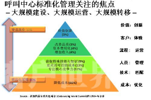 那么,對于這個(gè)尚處在”嬰兒潮”時(shí)期的產(chǎn)業(yè),我們最應(yīng)該做些什么來呵護(hù)和培育這個(gè)產(chǎn)業(yè)健康有序的發(fā)展?大家要好好呵護(hù)這個(gè)行業(yè)。如果只是強(qiáng)調(diào)“要想讓呼叫中心發(fā)展,那就需要我們多投錢,這樣就能買許多機(jī)器,放在公司里面。規(guī)格有了,那呼叫中心就發(fā)展了!蔽矣X得這樣的說法是對呼叫中心發(fā)展的錯(cuò)誤理解。我們這個(gè)標(biāo)準(zhǔn)是希望營建專業(yè)化的產(chǎn)業(yè),整個(gè)呼叫中心產(chǎn)業(yè)的價(jià)值金字塔,這個(gè)金字塔每年在美國有一個(gè)專場,就叫呼叫中心專場,標(biāo)志一個(gè)產(chǎn)業(yè)成熟的金字塔是怎樣的。通過調(diào)查發(fā)現(xiàn),當(dāng)產(chǎn)業(yè)進(jìn)入成熟階段,標(biāo)準(zhǔn)化服務(wù)的第一個(gè)就是降低成本,也就是提高生產(chǎn)效益,能夠把這個(gè)產(chǎn)業(yè)細(xì)化分解,高度的模塊化進(jìn)行精細(xì)控制的時(shí)候,其他的差異化的體現(xiàn)。呼叫中心本身是不是成為企業(yè)核心競爭力的一部分,或者說越來越成熟的外包商出現(xiàn),能夠把一些企業(yè)非核心競爭力加入到自己的核心競爭力之上,這叫專業(yè)化。還有一個(gè)更加靈活可控的成本,呼叫中心的彈性從一百人到一千人,一千人到三千人的發(fā)展更加可控。還有獲得特殊技能與知識,事實(shí)上呼叫中心各行各業(yè)知識都會接觸,你只有專著才能做得更好,本身對于呼叫中心的從業(yè)人員來說,在這個(gè)產(chǎn)業(yè)中扮演的角色不是締造一個(gè)企業(yè)的核心競爭力,怎么期望從業(yè)人員掌握更多的技能和知識,來指導(dǎo)更多的行業(yè)和企業(yè)。特別是在客戶導(dǎo)向上面的發(fā)展,還有在金字塔上面增加收入,分析客戶所需,讓我們更好的滿足客戶的需求;然后資本費(fèi)用化,從外包專業(yè)化領(lǐng)域帶來的變化,很多的時(shí)候最大的一筆建設(shè)是呼叫中心,基本一個(gè)中等的呼叫中心沒有500萬以上的資金投入是不可想象的。
