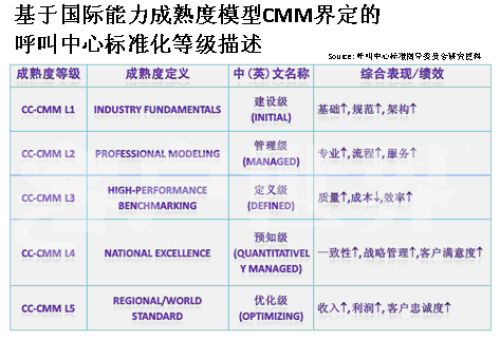 Markets)呼叫中心產(chǎn)業(yè)深入研究相結(jié)合的成果。。我在前幾年企業(yè)實(shí)施標(biāo)準(zhǔn)的時(shí)候深入研究了這套模型,這套模型對我們呼叫中心產(chǎn)業(yè)有極大的適用性,幾乎每個(gè)呼叫中心都可以在這套模型找到定位,從一個(gè)渾沌的初始過程到管理者,如果能夠建設(shè)一個(gè)持續(xù)的管控的流程到定義級,如何進(jìn)行一致化管理,再到預(yù)知級,幾乎每個(gè)呼叫中心從大到小,從年輕到發(fā)展一段時(shí)間都可以找到自己的定位,所以我們在原來的信息產(chǎn)業(yè)指導(dǎo)委員會的支持下,我們重新結(jié)合CMM模型開發(fā)出了符合我們呼叫中心發(fā)展的一個(gè)標(biāo)準(zhǔn),我建議大家把它看成是一個(gè)模型,整個(gè)國際產(chǎn)業(yè)都定性了標(biāo)準(zhǔn),因?yàn)榇蠹叶贾繡MM模型是一個(gè)開放性的知識體系,并不是一個(gè)封閉標(biāo)準(zhǔn)。CMM模型,首先你的呼叫中心建設(shè)要能夠符合呼叫中心的定義,不是找?guī)着_話機(jī)或?qū)ν庥袀(gè)一個(gè)客服號碼對外就能稱為呼叫中心。