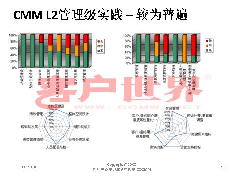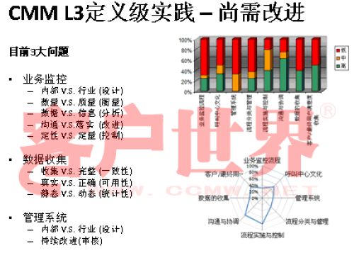 接下來我用一個(gè)很小的案例結(jié)束今天的分享,我們整個(gè)的呼叫中心的成熟度模型目前是在電信行業(yè)開始了2008年版的推廣,成熟度模型經(jīng)歷從07年成立亞太呼叫中心產(chǎn)業(yè)聯(lián)盟以后,由一群這個(gè)行業(yè)里面的專家,特別是中國產(chǎn)業(yè)市場的發(fā)展建立起的標(biāo)準(zhǔn),一年以來在通信行業(yè)我們做的能力成熟度的判定有一些很有意思的啟示,通信行業(yè)占到我們整個(gè)呼叫中心產(chǎn)業(yè)約70%的坐席,是最大的、最有代表性的產(chǎn)業(yè)。做下來真的很有代表性,普遍性在于環(huán)境建設(shè)、資產(chǎn)投入、資產(chǎn)配置,所以這下面的雷達(dá)就可以看到,相對完善都是在環(huán)境建設(shè),功能區(qū)建設(shè),整體空間設(shè)計(jì)、硬件相對來說比較偏硬的一些。在其他方面偏廢的比較厲害。第二個(gè)雷達(dá)在一些獎懲管理、信息管理,整個(gè)軟性方面幾乎有很濃重的一些計(jì)劃經(jīng)濟(jì),制造行業(yè)的一些領(lǐng)域相對來說比較成熟。我們目前看到的,基本上通信行業(yè)的一些發(fā)展在能力成熟度上是二級到四級,尤其以二到三級的發(fā)展更為普遍。通常的方法為期一周的標(biāo)桿調(diào)研,看所有的呼叫中心發(fā)展的五個(gè)方面,我們才會在里面做這樣的判定。在能力成熟度的三級,我們做了一些企業(yè)發(fā)現(xiàn),特別在三級,關(guān)于能不能對流程進(jìn)行一致性管理方面,就是剛才李老師講到的不是最急的,而管理是最重要的?赡芩械牧鞒潭喽嗌偕儆幸恍┏墒於鹊膯栴},但是我們的源頭流程能力在三個(gè)方面有很大的差距:一個(gè)是業(yè)務(wù)監(jiān)控流程,第二個(gè)數(shù)據(jù)收集流程,還有一個(gè)是管理系統(tǒng)的審核流程。這個(gè)大家可以和自己的呼叫中心比一比。