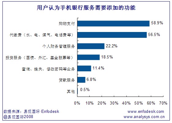 《2008年中國個人網上銀行市場用戶調研報告-手機銀行》研究發(fā)現(xiàn),用戶認為手機銀行需要添加的功能主要為購物支付和代繳費,分別占58.9%和56.5%。