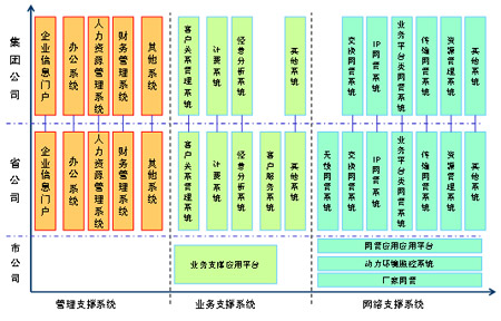 從系統(tǒng)的部署來看,主要集中在集團(tuán)與省公司,其中,集團(tuán)公司系統(tǒng)主要具備面向全公司的企業(yè)管理、經(jīng)營分析等功能;省公司從以職能管理為主逐步轉(zhuǎn)變?yōu)橐陨a(chǎn)管理為主,具有了越來越多的生產(chǎn)職能,在運(yùn)營支撐系統(tǒng)建設(shè)中的作用更加突出;市公司的生產(chǎn)管理職能有所削弱,將主要負(fù)責(zé)市場的具體營銷、客戶支撐以及設(shè)備的現(xiàn)場維護(hù)等工作。現(xiàn)有系統(tǒng)主要存在以下幾個(gè)問題: