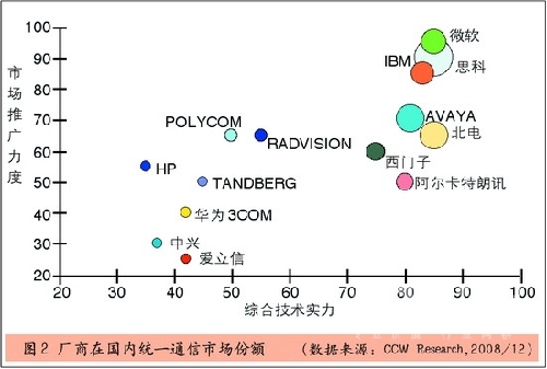 從當(dāng)前國(guó)內(nèi)統(tǒng)一通信市場(chǎng)競(jìng)爭(zhēng)格局來看,在綜合技術(shù)實(shí)力方面,根據(jù)廠商所提供的統(tǒng)一通信解決方案中所能夠提供的各種溝通方式融合的程度以及每個(gè)具體功能技術(shù)水平等綜合因素考慮,處于前幾位的分別是思科、微軟、北電、IBM和Avaya,它們的產(chǎn)品線比較長(zhǎng),產(chǎn)品功能也相對(duì)比較全面。