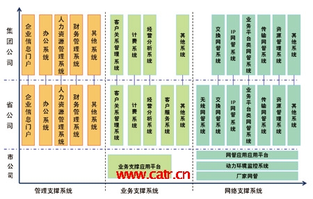 從系統(tǒng)部署來看,目前各大運(yùn)營(yíng)企業(yè)都以集團(tuán)與省公司為主要的建設(shè)與管理維護(hù)單位,建成了集團(tuán)與省兩級(jí)模式的支撐系統(tǒng)。集團(tuán)公司的系統(tǒng)主要提供面向全公司的企業(yè)管理、經(jīng)營(yíng)分析等功能;省公司從職能管理單位逐步轉(zhuǎn)向了兼顧管理、生產(chǎn)的單位,具有了越來越多的生產(chǎn)職能,在運(yùn)營(yíng)支撐系統(tǒng)建設(shè)中的作用較為突出,一般情況下,在遵循集團(tuán)公司的總體指導(dǎo)思想下,可自行規(guī)劃與建設(shè)本省的支撐系統(tǒng);市公司的生產(chǎn)職能有所削弱,主要負(fù)責(zé)市場(chǎng)營(yíng)銷、客戶支撐以及設(shè)備的現(xiàn)場(chǎng)維護(hù)等工作,因而主要是支撐系統(tǒng)的使用單位。