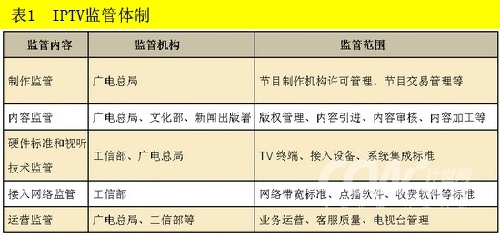 根據(jù)國務(wù)院直屬部委機(jī)構(gòu)的職能劃分,國家將信息產(chǎn)業(yè)、廣播電影電視產(chǎn)業(yè)分別交給工信部和國家廣電總局管理。由表1可以看出,在IPTV的監(jiān)管方面,國家廣電總局起著舉足輕重的作用,尤其是關(guān)于節(jié)目制作和運營方面的監(jiān)管,對IPTV的發(fā)展影響重大,隨時都有可能出臺新的規(guī)定,影響整個IPTV的發(fā)展。