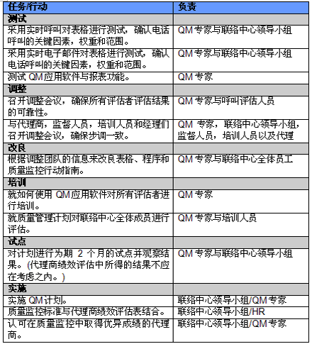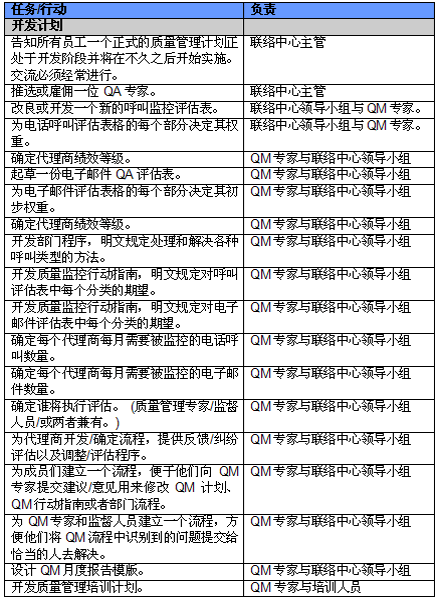 4. 開展項(xiàng)目交流。管理人員必須就新的或者修繕后的QM計(jì)劃與代理商進(jìn)行交流。QM的成功與否與代理商的合作密不可分,如果代理商受邀參與新QM計(jì)劃的開發(fā)并且所有改變都在雙方之間明確交流過,那么成功的機(jī)會(huì)也將大大提高。交流的內(nèi)容應(yīng)包括為什么要開發(fā)這樣一個(gè)計(jì)劃,它的作用和職責(zé)是什么,它對代理商會(huì)產(chǎn)生哪些影響(對于他們的評估和提升)以及它能帶來哪些好處。幫助代理商認(rèn)識到QM計(jì)劃積極的一面很重要,因?yàn)橹挥羞@樣才能讓他們看到QM不僅僅是管理人員用來告訴他們做錯(cuò)了事情的一種手段。讓聯(lián)絡(luò)中心全體員工參與QM計(jì)劃的開發(fā)能夠建立他們對該計(jì)劃的支持,提高接受度的同時(shí)避免不知所措。這對聯(lián)絡(luò)中心剛剛嶄露頭角,QM計(jì)劃還未全面鋪開的中國市場而言尤為重要。