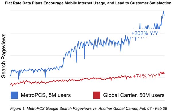 這里以美國一家地區(qū)性的小運(yùn)營商MetroPCS為例,MetroPCS的CDMA用戶數(shù)剛超過500萬。在過去的一年里,MetroPCS的Google搜索量增長了2.5倍。而這個(gè)數(shù)字,是那些全球性的、擁有大量用戶和3G網(wǎng)絡(luò)運(yùn)營商的10倍。