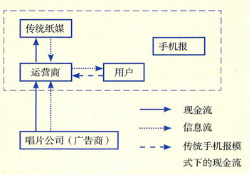 第一種情形的盈利模式如圖所示,以運(yùn)營(yíng)商為例,傳統(tǒng)的手機(jī)報(bào)業(yè)務(wù),其收入局限于用戶(hù)支付的定制費(fèi)收入分成(虛線(xiàn)框所示)。而在新的商業(yè)模式下,運(yùn)營(yíng)商的收入將主要來(lái)源于唱片公司的新歌推介廣告費(fèi),同時(shí)扣除與傳統(tǒng)紙媒的收入分成,體現(xiàn)了業(yè)務(wù)的媒體經(jīng)濟(jì)屬性。同時(shí)用戶(hù)不僅可以免費(fèi)試聽(tīng)歌曲,而且還可獲贈(zèng)一定流量的免費(fèi)新聞資訊。