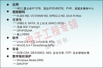 H.264、WM9、AVS的STB810平臺(tái)和用于HD H.264 a和VC1的STB225平臺(tái)。IP-STB平臺(tái)應(yīng)該提供一個(gè)驗(yàn)證核技術(shù),例如NXP公司基于Nexperia技術(shù)的平臺(tái),并且每一個(gè)研發(fā)工具都向后兼容。