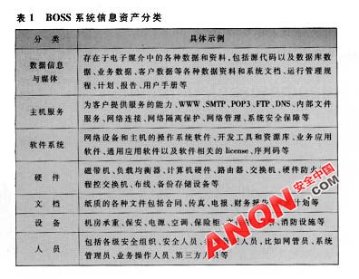 BOSS系統(tǒng)涉及的信息繁多,如何保護(hù)關(guān)鍵的數(shù)據(jù)不被泄漏是運(yùn)營(yíng)商非常重視的一個(gè)問題。信息分級(jí)用來評(píng)估運(yùn)營(yíng)商是否建立了信息資產(chǎn)管理的規(guī)范,明確了信息資產(chǎn)的內(nèi)容和級(jí)別,制定了有效的安全保護(hù)措施,如果沒有,應(yīng)該明確BOSS系統(tǒng)內(nèi)的關(guān)鍵信息資產(chǎn)并列出清單,依據(jù)國(guó)家保密級(jí)別制定科學(xué)的信息資產(chǎn)分級(jí)標(biāo)準(zhǔn),并作為風(fēng)險(xiǎn)評(píng)估的依據(jù)。參照國(guó)際信息系統(tǒng)安全標(biāo)準(zhǔn)BS7799/ISO17799對(duì)信息資產(chǎn)的描述和定義,可以將BOSS系統(tǒng)信息資產(chǎn)按照表1的方法進(jìn)行分類。