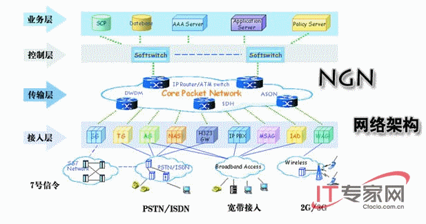 下一代網(wǎng)絡(luò)(NGN)是指以軟交換為代表,IMS為核心框架,能夠?yàn)楣婌`活提供大規(guī)模視訊話音數(shù)據(jù)等多種通信業(yè)務(wù),以分組交換為業(yè)務(wù)統(tǒng)一承載平臺(tái),傳輸層適應(yīng)數(shù)據(jù)業(yè)務(wù)特征及帶寬需求,與通信運(yùn)營商相關(guān),可運(yùn)營、維護(hù)、管理的通信網(wǎng)絡(luò)。