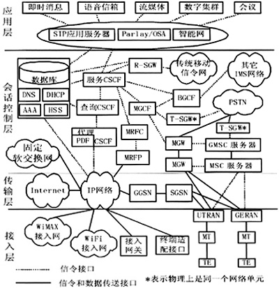 應(yīng)用層包括SIP應(yīng)用服務(wù)器、Parlay/OSA和智能網(wǎng)。Parlay/OSA提供的標(biāo)準(zhǔn)應(yīng)用編程接口(API),提供了一個(gè)開放的業(yè)務(wù)平臺(tái),有利于第三方的業(yè)務(wù)提供。具體的業(yè)務(wù),如語(yǔ)音、視頻、即時(shí)消息、數(shù)字集群等都可以融合在統(tǒng)一的平臺(tái)上。