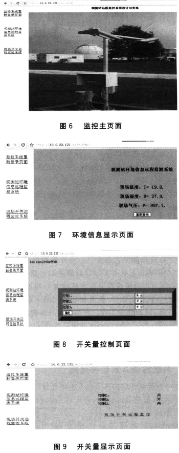 該監(jiān)控主頁面左側(cè)顯示有3個(gè)模塊:重新登陸頁面;觀測(cè)站遠(yuǎn)程環(huán)境信息檢測(cè)系統(tǒng),能方便實(shí)時(shí)地查詢現(xiàn)場(chǎng)的環(huán)境狀態(tài),如圖7所示;現(xiàn)場(chǎng)開關(guān)的遠(yuǎn)程監(jiān)控系統(tǒng),可以控制3個(gè)開關(guān)量的開關(guān),如圖8所示,并能查詢它們當(dāng)前狀態(tài),設(shè)置監(jiān)控頁面每隔15