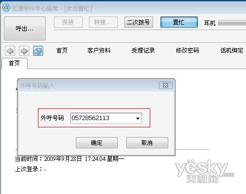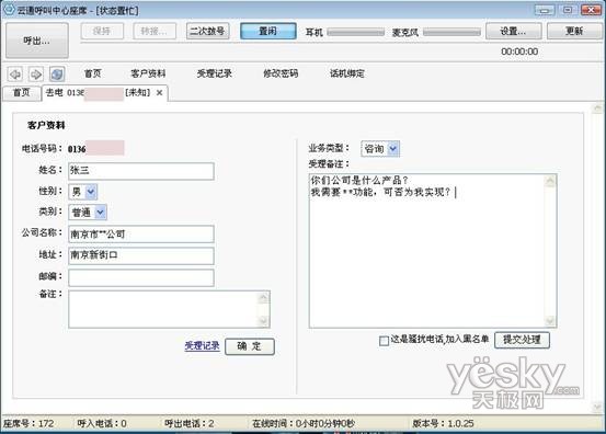 除此之外,當使用座席軟件呼出時,若該號碼之前撥打過并留下過相關(guān)客戶信息,彈屏內(nèi)容會顯示其詳細的個人信息,并提供歷史受理記錄的查詢接口,起到輔助營銷人員的受理工作的作用,試問,如果再次撥打電話時就能詳細說出用戶的姓名以及當時所提的需要,他是否會覺得很親切?(如下圖)如果該號碼未有客戶資料的記錄時,彈屏?xí)苯訛榭头峁┛蛻粼斍樘顚戫撁妫阌跔I銷人員很方便的就可以建立該客戶的個人檔案,提高受理效率。