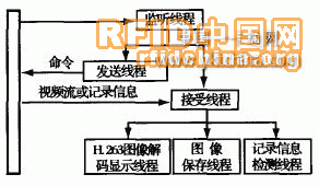 在軟件設計方面包括兩部分,一部分是監(jiān)控終端的監(jiān)控軟件,另一部分是各便件的底層軟件。監(jiān)控終端采用了多線程的軟件設計方法,系統(tǒng)對連接的每一個監(jiān)控點共采用了6個線程,即網(wǎng)絡監(jiān)聽線程、發(fā)送線程、接受線程、H.26 3圖像解碼顯示線程、圖像保存線程和記錄信息(門口終端的撥號、門禁一卡通等記錄信息)檢測線程,如圖4所示。