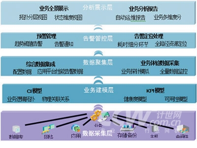 數(shù)據(jù)聚集層: 在這一層,系統(tǒng)將經(jīng)過(guò)CI/KPI模型、按不同業(yè)務(wù)規(guī)則結(jié)構(gòu)化之后的三類(lèi)用戶體驗(yàn)數(shù)據(jù)進(jìn)行匯聚:業(yè)務(wù)監(jiān)控?cái)?shù)據(jù)(業(yè)務(wù)可用性、業(yè)務(wù)量、業(yè)務(wù)辦理時(shí)長(zhǎng)、業(yè)務(wù)的后臺(tái)服務(wù)器負(fù)載情況等)、配置數(shù)據(jù)(從CMDB中定時(shí)同步配置項(xiàng)信息和配置關(guān)聯(lián)信息),業(yè)務(wù)感性數(shù)據(jù)(業(yè)務(wù)量、積壓量和投訴等信息),使得運(yùn)維人員不僅能夠從IT支撐視角掌握業(yè)務(wù)運(yùn)行狀況,還能直觀了解到在當(dāng)前業(yè)務(wù)運(yùn)行情況之下客戶層面的使用感知。