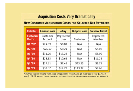 上世紀90年代末期DOT.COM就遭遇了這一嚴峻問題。70% - 80%的客戶在沒有完成采購之前就棄網(wǎng)站而去。對于許多人來說這被認為是一個“行業(yè)基準”,屬于可接受水平,但也有些人開始尋找解決方案。整個行業(yè)開始注意到分析家們的忠告:這一水平的放棄率是不被允許的。下面這張由Yankee集團在2000年發(fā)布的表格向我們展示了電子商務企業(yè)客戶獲取成本螺旋形盤升的過程。