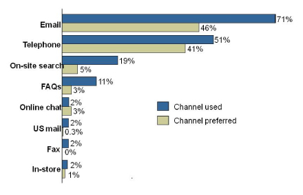 (借助電子郵件響應管理系統(tǒng)) 電子郵件的確能為客戶解決一些非實時的問題但卻無法在瀏覽者/愿景客戶購買興趣最高的時候回答他們的詢問,PeopleSupport在其調(diào)研中提到這一事實造成的結(jié)果就是大量銷售機會僅僅因為“個人服務”和“接觸方式偏好”而流失。