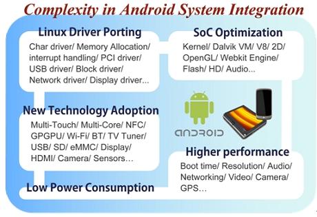 對廠商而言,開發(fā)一款A(yù)ndroid設(shè)備,不僅僅只是將所有零組件組合成為一個產(chǎn)品那么容易,最大的學(xué)問便在于將系統(tǒng)單芯片(System-on-a-chip,SoC)、各種新技術(shù)和Android系統(tǒng)進(jìn)行整合,SoC涉及像是Dalvik Virtual Machine、OpenGL、V8、Webkit Engine等上層的演算,與Android間的結(jié)合便必須透過不斷的嘗試與驗證,才能研發(fā)出既符合成本效益、又有良好效能的優(yōu)化產(chǎn)品。目前市面上有些SoC廠商已針對Android系統(tǒng)的特性,提供整合過的SoC平臺,將藍(lán)牙、相機(jī)或上網(wǎng)等常用功能模組預(yù)先寫入,減少終端成品廠商費(fèi)力整合開發(fā)的時間,但對廠商而言,這樣的預(yù)先整合是否適合自身產(chǎn)品,以及是否需要再作更細(xì)致的修改,則又是更困難的課題。