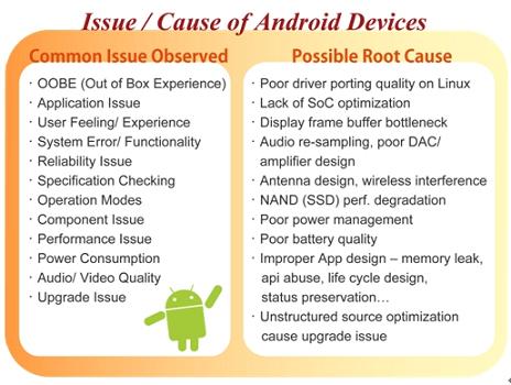盡管Android系統(tǒng)的普及看似指日可待,但在實際的產(chǎn)品應(yīng)用上,也有其可能產(chǎn)生的問題風(fēng)險。Android作為一個開放式的操作系統(tǒng),是Google提供廠商的操作系統(tǒng)參考架構(gòu)(reference design),廠商能有充足的發(fā)揮空間,以Android為基礎(chǔ)向上開發(fā)設(shè)計自家產(chǎn)品,但也因為這樣的開放性與自由性,讓廠商在軟硬件結(jié)合的這個環(huán)節(jié)必須下更大的功夫,像是如何挑選合適的硬件包括基頻處理器、通信芯片、觸控感應(yīng)芯片、天線與存儲器模組等,以及如何調(diào)整出最適當(dāng)?shù)能浖O(shè)定等,更重要的是如何將軟硬件整合,開發(fā)出差異化的產(chǎn)品。這中間所有的細(xì)節(jié)都會對產(chǎn)品最終樣貌產(chǎn)生莫大的影響,像是其功能的完整度、使用接口的設(shè)計、效能表現(xiàn)(例如觸控滑動畫面、開啟程序所需時間)、品質(zhì)可靠度、甚至是后續(xù)的固件升級動作等等。在此百佳泰便試圖以專業(yè)中立的測試實驗室角度,來點(diǎn)出廠商應(yīng)用Android于手機(jī)、平板電腦或其他設(shè)備時應(yīng)注意的開發(fā)重點(diǎn),以希冀作為一個有效的參考資訊。