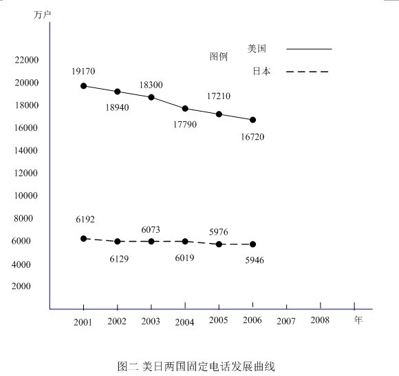 〔3〕大約有2%的美國家庭沒有電話。IBB咨詢公司資深分析師表示,「美國擁有大量愛講電話的人,可以隨處打電話正是美國人熱衷的事情! 大型傳統(tǒng)電話公司如AT&T、威瑞森(Verizon),受到美國人的這一偏好的影響,移動通信業(yè)務(wù)現(xiàn)都已經(jīng)超過了他們原本的核心業(yè)務(wù)(固定電話)。據(jù)桑福.伯恩斯坦公司的調(diào)查顯示,紐約地區(qū)固定電話的數(shù)量,從2000年以來已經(jīng)下降了55%,新澤西的情況也差不多,下降了50%。德州下降了20%,加州下降了21%。在年輕用戶中這個趨勢更為明顯:34.5%的25到29歲年齡段者,家中只有移動電話,30到44歲年齡段者,這個比例下降至15.5%,65歲以上者,只有2.2%。雖然移動電話對固定電話的取代作用,日美兩國基本相似,但在日本通信公司卻是IP電話和VoIP電話的主要提供者,因此日本固定電話歷年下降曲線就比較平坦,不像美國那樣厲害,請見圖二。
