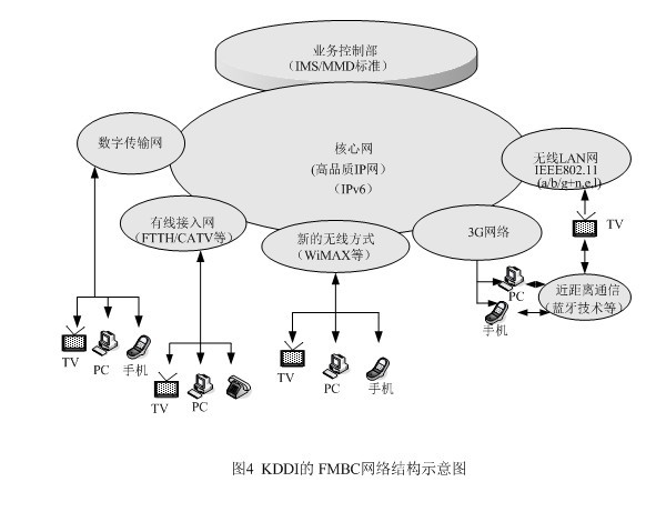 為了在市場競爭中立于不敗之地,KDDI另辟稀徑,提出了將固定網(wǎng)、移動網(wǎng)、因特網(wǎng)和電視廣播相融合的概念,它與朝日新聞、朝日電視簽署合作框架,就是它的集中代表。FMBC是超3G的構(gòu)想,是以移動通信為基礎(chǔ),與固定電話網(wǎng)及因特網(wǎng)進行融合,現(xiàn)在又把廣播電視納入,這樣它就成了KDDI的NGN了。FMBC的網(wǎng)絡(luò)結(jié)構(gòu)請見圖4。從圖4上不難發(fā)現(xiàn)NGN的影子,特別是業(yè)務(wù)控制部的設(shè)立,并采用ISM/MMD標準,將網(wǎng)絡(luò)與應用分開,以利新業(yè)務(wù)的開拓,同時完成核心網(wǎng)的IP化,這些都是NGN的基本概念。