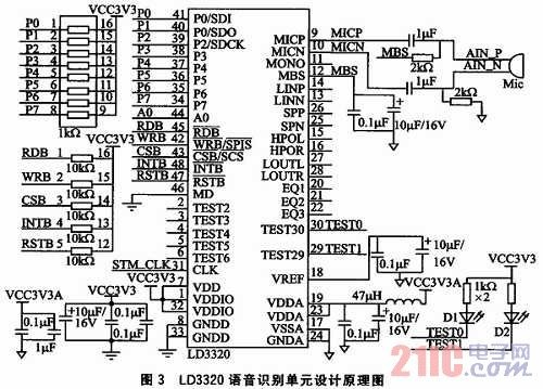 圖3為語音識別部分原理圖,參照了ICRoute發(fā)布的LD3320數(shù)據(jù)手冊進(jìn)行設(shè)計。LD3320的內(nèi)部集成了快速穩(wěn)定的優(yōu)化算法,不需外接Fla-sh、RAM,不需要用戶事先訓(xùn)練和錄音而完成非特定人語音識別,識別準(zhǔn)確率高。