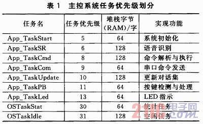 表1中除OSTaskStat和OSTaskIdle任務(wù)為系統(tǒng)自帶,其他7個任務(wù)均為用戶創(chuàng)建。App_TaskStart是系統(tǒng)的第一個任務(wù),對系統(tǒng)時鐘和底層設(shè)備進(jìn)行初始化,創(chuàng)建所有事件和其他各項用戶任務(wù),并對系統(tǒng)狀態(tài)進(jìn)行監(jiān)測;App_TaskSR完成語音識別;App_TaskCmd完成對話集中命令的解析和執(zhí)行,并通過USART1向外發(fā)送;App_TaskCom作為外圍擴展任務(wù),通過USART2向外發(fā)送指令或數(shù)據(jù),負(fù)責(zé)控制外圍擴展設(shè)備,如語音合成設(shè)備等;