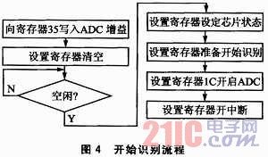 ③開始識別。設(shè)置幾個相關(guān)的寄存器,即可開始語音的識別。圖4是相關(guān)的流程。ADC通道即為麥克風(fēng)輸入通道,ADC增益也就是麥克風(fēng)音量,可設(shè)定值00H~7FH,建議設(shè)置值為40H~6FH,值越大代表MIC音量越大,識別啟動越敏感,但可能帶來更多誤識別;值越小代表MIC音量越小,需要近距離說話才能啟動識別功能,好處是對遠(yuǎn)處的干擾語音沒有反應(yīng)。本文中設(shè)定值為43H。