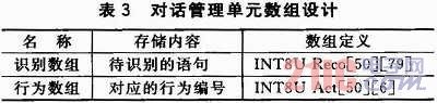 為了方便進(jìn)行對話的管理,本文中設(shè)計了一個對話管理單元,用于對等待識別的語句和等待執(zhí)行的命令進(jìn)行存儲,在主控制器中通過定義二維數(shù)組來實現(xiàn)。LD3320每次識別最多可以設(shè)置50項候選識別句,每個識別句可以是單字、詞組或短句,長度為不超過10個漢字或者79個字節(jié)的拼音串;谏鲜鲈颍疚脑O(shè)計的對話管理數(shù)組如表3所列。