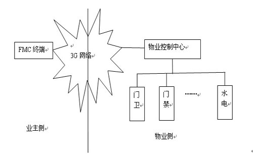 如何實(shí)現(xiàn)由業(yè)主決定是否讓來(lái)訪者進(jìn)入小區(qū)呢?利用FMC技術(shù)實(shí)現(xiàn)小區(qū)的物業(yè)管理(為了敘述方面,簡(jiǎn)稱為FMC小區(qū)),就能容易解決。下圖為FMC小區(qū)的拓?fù)浣Y(jié)構(gòu)圖。