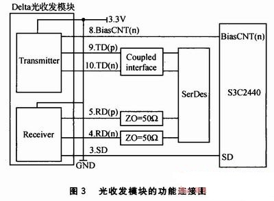 光收發(fā)模塊的功能連接圖如圖3所示。其中3.SD是光收發(fā)模塊的第3個(gè)引腳,它的功能可以描述為有光輸入時(shí)為邏輯高,否則為邏輯低;4.RD(n)是第4個(gè)引腳,反向接收數(shù)據(jù)的輸出;5.RD(p)是第5個(gè)引腳,正向接收數(shù)據(jù)的輸出;8.BiasCNT(n)是第8個(gè)引腳,控制ONU突發(fā)模式操作的負(fù)脈沖;9.TD(p)是第9個(gè)引腳,正向發(fā)送數(shù)據(jù)的輸入;10.TD(n)是第10個(gè)引腳,反向發(fā)送數(shù)據(jù)的輸入。