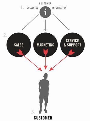 傳統(tǒng)CRM是將公司搜集到的消費(fèi)者有關(guān)信息輸入到CRM系統(tǒng)中,通過(guò)銷(xiāo)售、市場(chǎng)推廣以及產(chǎn)品服務(wù)等措施,借此有可能獲得更多的潛在目標(biāo)消費(fèi)者。