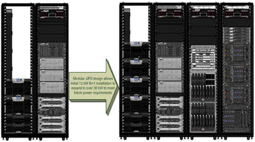模塊化UPS設(shè)計(jì)允許最初的12kW N+1架構(gòu)設(shè)備擴(kuò)展至36kW以上,以滿足未來(lái)的電源要求。