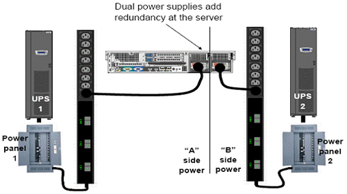 2(N)架構(gòu)與含有雙電源的服務(wù)器配合使用。在這種排列中,每個(gè)電源一般都是利用一個(gè)獨(dú)立的供電路徑。那樣,即使整個(gè)動(dòng)力總成都關(guān)機(jī)進(jìn)行維修或維護(hù),服務(wù)器仍然可用。
