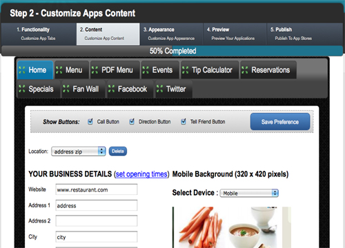 Bizness Apps采用可視化操作界面,用戶只需要點(diǎn)擊設(shè)置相關(guān)選項(xiàng)就能完成應(yīng)用的開發(fā)工作。因此,Bizness Apps很適合缺少專業(yè)技術(shù)人員的小企業(yè)開發(fā)本行業(yè)應(yīng)用。利用Bizness Apps開發(fā)行業(yè)應(yīng)用只需五步。首先,開發(fā)者選擇對應(yīng)的行業(yè)后,需要為應(yīng)用添加功能組件。第二步,為訂制好的功能組件添加內(nèi)容。第三步,為應(yīng)用選定外觀的設(shè)計方案。第四步,預(yù)覽經(jīng)過定制后的應(yīng)用。最后,完成付費(fèi)后即可發(fā)布你的應(yīng)用。