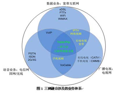 這種沖擊表現(xiàn)在信息通信領(lǐng)域的“時(shí)移事易”上,一個(gè)是在時(shí)間維度上,一個(gè)是在影響產(chǎn)業(yè)發(fā)展重大事件的維度上。其長(zhǎng)期累積的結(jié)果是,當(dāng)前全球范圍內(nèi)影響最大、最深遠(yuǎn)的莫過(guò)于寬帶網(wǎng)絡(luò)成為國(guó)家的信息化基礎(chǔ)設(shè)施。寬帶的普及深刻的影響和推動(dòng)了以TCP/IP為技術(shù)基礎(chǔ)的“三重播放”和在市場(chǎng)競(jìng)爭(zhēng)層面的“多重捆綁”業(yè)務(wù)營(yíng)銷(xiāo)策略,這構(gòu)成了三網(wǎng)融合最基本的內(nèi)容,隨之帶動(dòng)了近年已成為業(yè)界關(guān)注焦點(diǎn)的視頻業(yè)務(wù)向“一云三網(wǎng)多屏”的方向發(fā)展?傊录夹g(shù)和新產(chǎn)業(yè)發(fā)展導(dǎo)致傳統(tǒng)的電信業(yè)和廣播電視業(yè)從封閉逐步走向開(kāi)放,渠道、內(nèi)容、消費(fèi)者偏好均從單一走向多元;對(duì)消費(fèi)者而言,信息的流動(dòng)從單向變?yōu)殡p向和多向,新媒體、全媒體、自媒體在社會(huì)上的份量快速上升。 而來(lái)自市場(chǎng)的需求變化是:過(guò)去那種內(nèi)容和服務(wù)緊密捆綁于網(wǎng)絡(luò)的業(yè)務(wù)模式被開(kāi)放的互聯(lián)網(wǎng)沖擊得疲于招架,網(wǎng)絡(luò)和渠道的地位不斷下降,處于底層的網(wǎng)絡(luò)整合開(kāi)始朝著契合于上層內(nèi)容和應(yīng)用整合的方向發(fā)展;內(nèi)容和應(yīng)用成為產(chǎn)業(yè)發(fā)展的新重心,傳統(tǒng)運(yùn)營(yíng)商在挖潛增效做好“智能管道”的同時(shí),也希望借助三網(wǎng)融合躋身綜合信息服務(wù)領(lǐng)域。表現(xiàn)在網(wǎng)絡(luò)層面,傳統(tǒng)的電信業(yè)務(wù)大范圍地向?qū)拵P網(wǎng)上遷移;傳統(tǒng)的有線電視網(wǎng)進(jìn)軍新媒體,“電信化”色彩越來(lái)越強(qiáng)。在業(yè)務(wù)層面,如下圖示所,典型的融合業(yè)務(wù)如有線寬帶、IPTV、VoIP、手機(jī)視頻、互聯(lián)網(wǎng)智能電視等成為雙方競(jìng)爭(zhēng)的主陣地。
