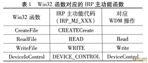 在Windows中,應(yīng)用程序與WDM通信的實現(xiàn)過程:應(yīng)用程序應(yīng)先獲得設(shè)備句柄GUID碼,然后利用CreateFile函數(shù)打開設(shè)備,通過 DeviceIoControl函數(shù)傳遞控制代碼參數(shù)和WDM進行通信,包括從WDM中讀取數(shù)據(jù)和寫數(shù)據(jù)給WDM兩種情況,也可利用ReadFile從 WDM中讀取數(shù)據(jù)或用WriteFile寫數(shù)據(jù)給WDM:當下層驅(qū)動有觸發(fā)事件時,就需要Event事件通知上層軟件。當應(yīng)用程序退出時,CloseHandle則關(guān)閉設(shè)備,這將產(chǎn)生對應(yīng)于此設(shè)備對象的相應(yīng)IRP消息。這種關(guān)系如表1所列。