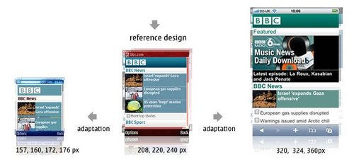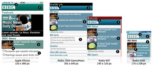 BBC還可以為特定的設(shè)備(或是一組設(shè)備)重新編排一些內(nèi)容。iPhone有非常豐富的功能,因此iPhone版的BBC還有音樂下載選項,而其他的設(shè)備可能只會顯示今天最熱門的‘BBC新聞’。可以根據(jù)數(shù)據(jù)的大小,多媒體的處理能力甚至是屏幕的尺寸決定是否需要針對iPhone提供更加豐富的內(nèi)容。以Nokia 6680上的‘特色’顯示為例,它大部分的顯示內(nèi)容是讓用戶滾動屏幕查看今天最熱門新聞故事。iPhone上顯示了三個新聞故事,而其中只有一篇配有插入。這使得用戶無需滾動屏幕就可以大致了解全部的咨詢。