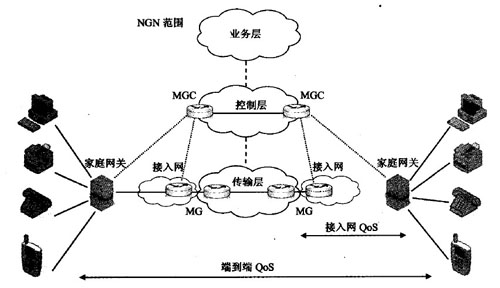 RG也是整個(gè)家庭網(wǎng)絡(luò)與外部網(wǎng)絡(luò)聯(lián)系的橋梁,是數(shù)字家庭各種業(yè)務(wù)和應(yīng)用的關(guān)鍵。ITU-T 已經(jīng)將家庭網(wǎng)絡(luò)納入NGN(新一代網(wǎng)絡(luò))的一部分,而RG將在其中扮演重要角色,RG在NGN中的位置及其與外部的連接如圖2所示,MGC為媒體網(wǎng)關(guān)控制器,MG為媒體網(wǎng)關(guān)。