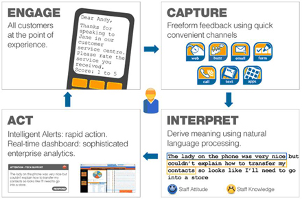 該應(yīng)用軟件能夠捕捉所有聯(lián)絡(luò)渠道上任何形式的客戶反饋;包括文本,郵件,電話,網(wǎng)絡(luò)或者手寫的。然后系統(tǒng)利用先進(jìn)的模式識別規(guī)則對客戶反饋進(jìn)行破譯并采取適當(dāng)?shù)男袆;直接響?yīng)客戶,將信息轉(zhuǎn)發(fā)給其他更適合響應(yīng)的人并創(chuàng)建實(shí)時管理信息。
