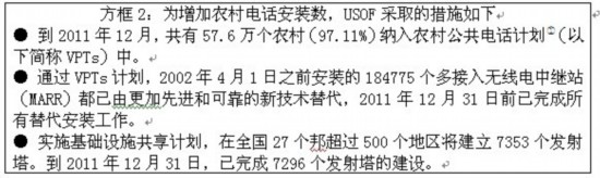 農(nóng)村電話安裝數(shù)從2007年3月的4710萬增加到2011年3月的2億8229萬,2011年12月達到3億1539萬。農(nóng)村電話數(shù)占全國電話總數(shù)的比例也從2007年的22.88%增加到2011年12月的34.04%。移動電話數(shù)量對農(nóng)村電話總數(shù)的增加貢獻很大。移動電話在農(nóng)村電話總數(shù)中的比重從2007年3月的73.33%提高到2011年3月的96.90%,到2011年12月達到97.53%。2011-2012年(到12月)期間,農(nóng)村電話數(shù)量的增長率為11.73%,而城市電話用戶增長率則為8.35%。個人用戶是農(nóng)村電話數(shù)增加的主要推動力,個人用戶占農(nóng)村電話總數(shù)的比重從2007年的51.87%上升到2011年2月的86.78%。為了增加農(nóng)村電話安裝總數(shù),USOF采取了以下措施,請見方框2所示。