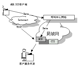 國(guó)際上一些先進(jìn)的 呼叫中心產(chǎn)品供應(yīng)商現(xiàn)在已經(jīng)把 Web 技術(shù)引入到他們的產(chǎn)品中了。通過(guò)屏幕上的一個(gè)按鈕可以利用 Internet 電話把客戶和呼叫中心連接起來(lái)?蛻羰褂靡粋(gè)很普通的帶有麥克風(fēng)﹑聲卡以及傳輸速率不小于 28.8 kbps 的Modem 的多媒體 PC 機(jī),并配有 Web 瀏覽器以及與 H.323兼容的應(yīng)用軟件就可以利用把他們連接到 Web 站點(diǎn)的那條電話線與呼叫中心的座席員交談。其簡(jiǎn)單示意圖如下: