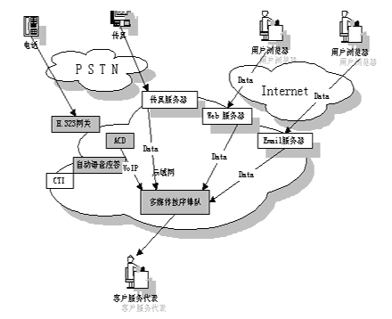 多媒體呼叫中心實(shí)際上是基于CTI 技術(shù)的傳統(tǒng)呼叫中心與 ICC 的相互結(jié)合,F(xiàn)在許多呼叫中心把各種媒體通信技術(shù)集成到了一起,允許座席員同時(shí)可以處理語(yǔ)音呼叫﹑Web請(qǐng)求﹑e-mail和傳真。其簡(jiǎn)單示意圖如下: