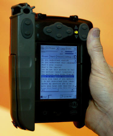 這款Marine Acoustics于2003年4月22日在舊金山的嵌入式系統(tǒng)會議(Embedded Systems Conference)上展示的新型語言翻譯機(jī),采用微軟CE系統(tǒng),可讓使用者對著機(jī)器說話,再將整句話翻成別國語言發(fā)聲,可做為隨身攜帶的移動翻譯機(jī)。目前美國軍方已采用數(shù)百部,配備給派駐在阿富汗以及伊拉克的美軍使用。