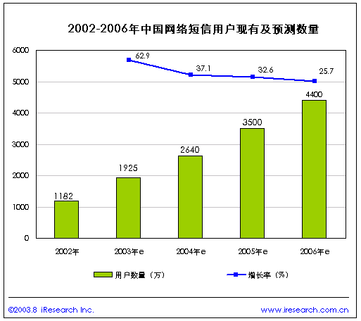 上海艾瑞市場咨詢有限公司是一家專注于網絡媒體、網絡營銷等網絡經濟領域的專業(yè)市場調研機構。公司近期發(fā)布《2003年中國網絡短信研究報告》,該報告中根據中國的網絡經濟發(fā)展情況預測:2003年中國網絡短信用戶將達到1925萬,2004年將達到2640萬。
