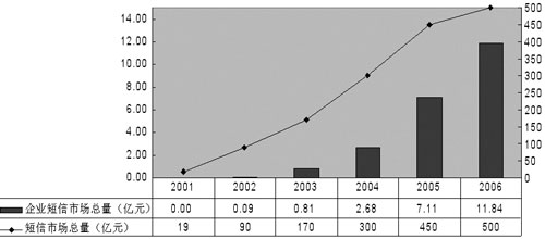 有數(shù)據(jù)顯示,2002年企業(yè)短信市場總量為0.09億元,2003年增長到0.81億元,預計2006年將突破10億元。終于,中國移動和中國聯(lián)通先后推出了面向企業(yè)用戶的“集團短信”業(yè)務,運營商對這個市場的重視使得一個新的產(chǎn)業(yè)鏈逐步完善起來,短信也開始“潤物細無聲”地改變著國內(nèi)企業(yè)的一些習慣。